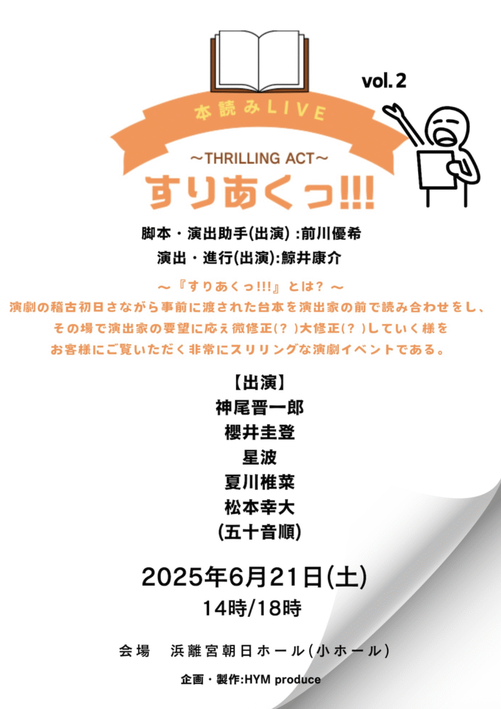 - 〜『すりあくっ!!!』とは?〜 演劇の稽古初日さながら事前に渡された台本を演出家の前で読み合わせをし、 その場で演出家の要望に応え微修正(?)大修正(?)していく様を お客様にご覧いただく非常にスリリングな演劇イベントである。